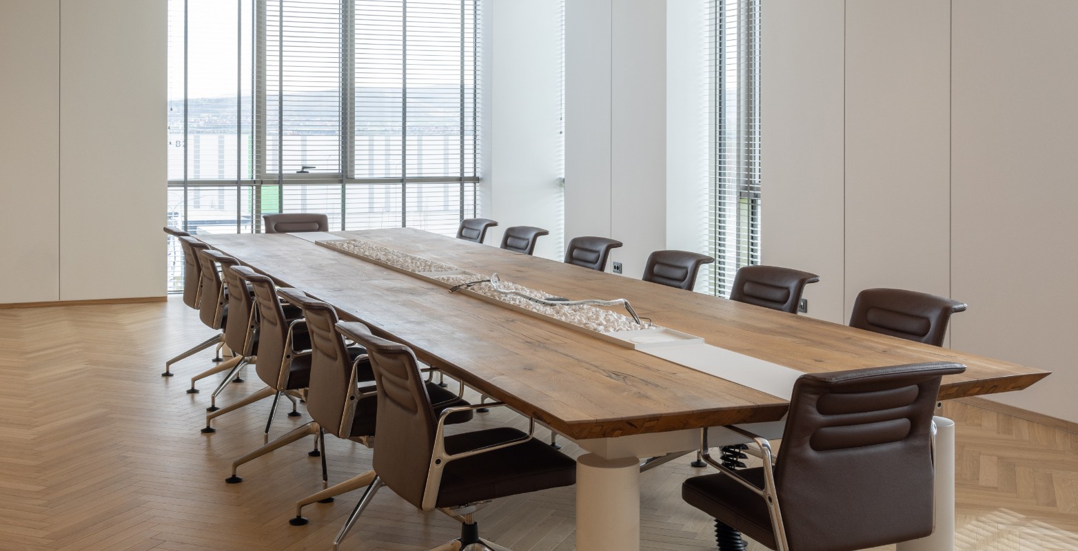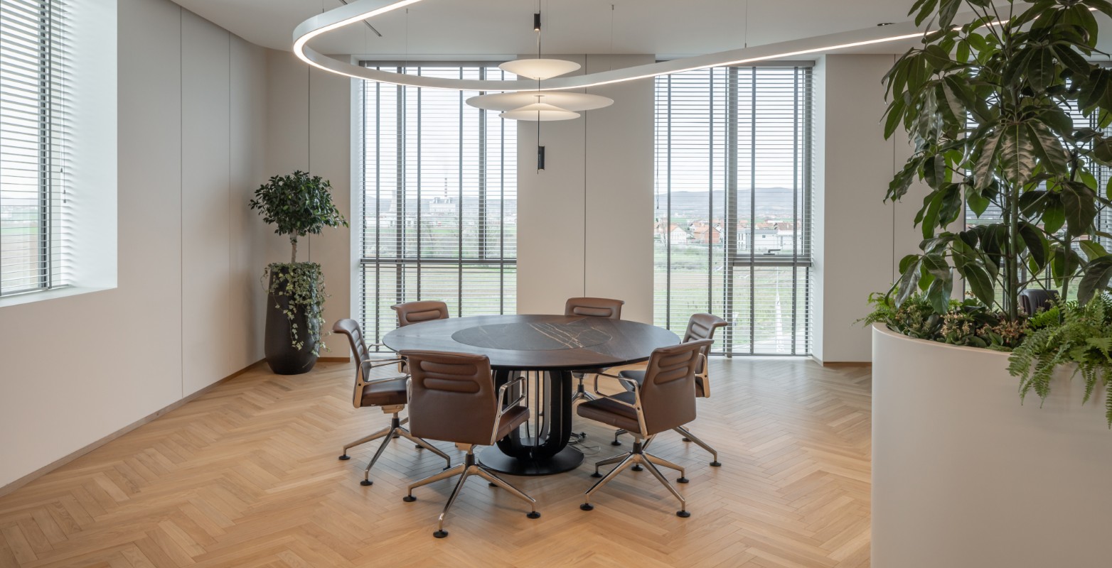 Comfortable seating, elegant meeting spaces and carefully designed lighting shape a professional and inviting atmosphere. The blend of concrete surfaces with warm wood accents adds character and energy, encouraging focus and collaboration.